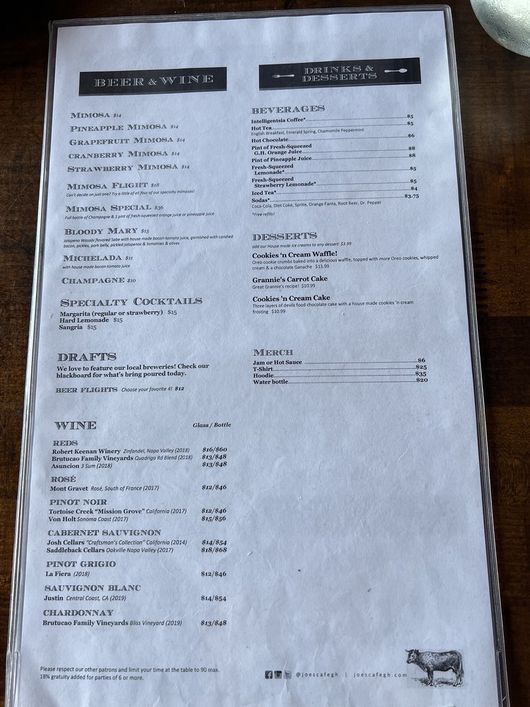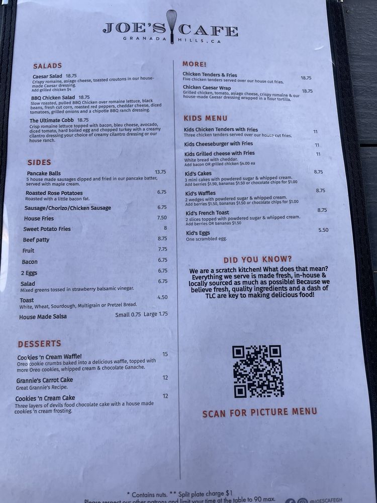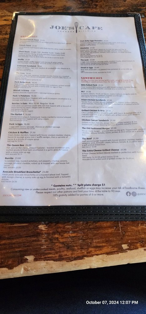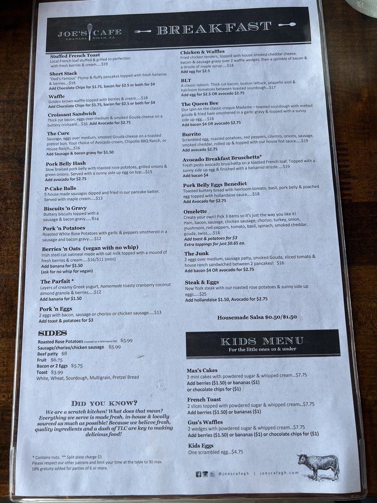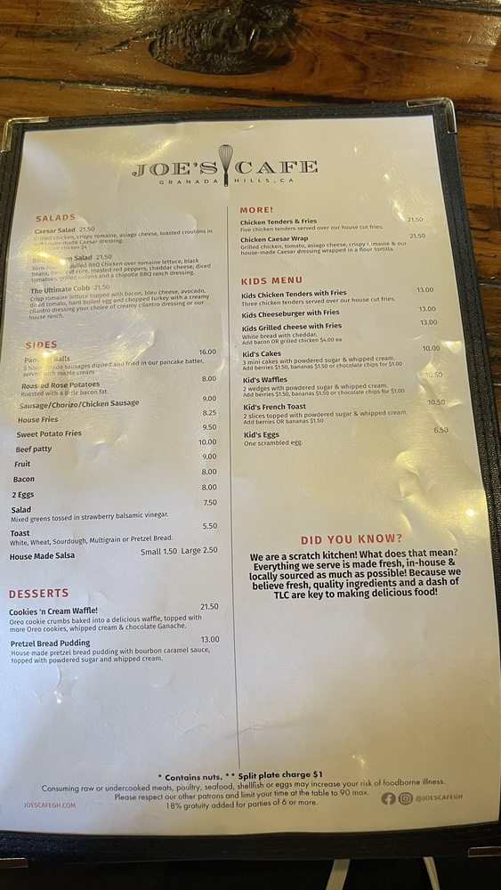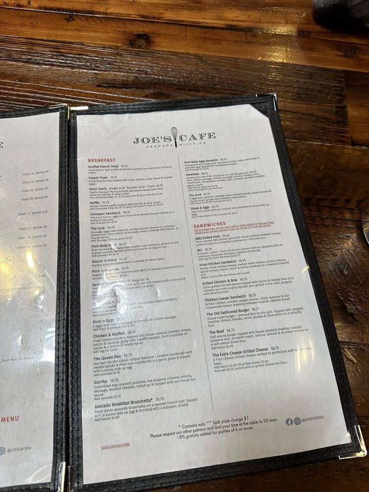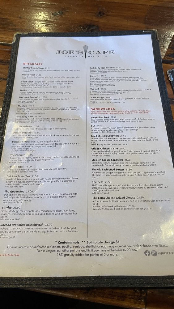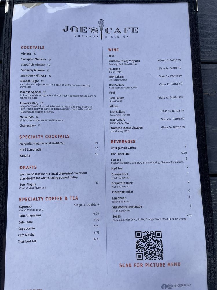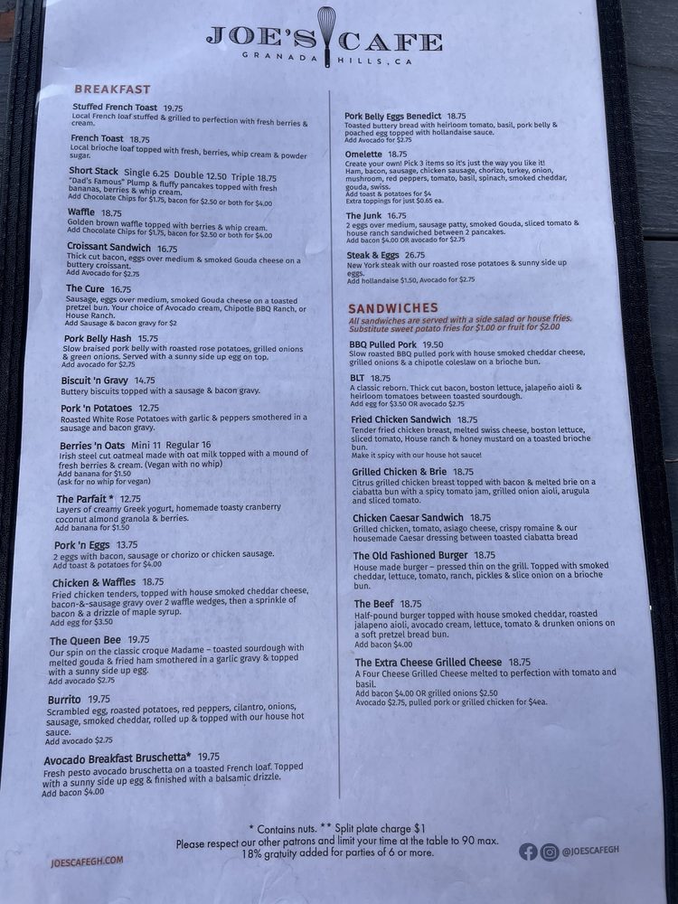 Joe’s Cafe, a cozy spot in Los Angeles, offers a diverse menu of New American cuisine focusing on breakfast and brunch. From French toast to stuffed waffles, every dish is made with fresh ingredients and a creative twist. The cafe also caters to special dietary needs with vegan and vegetarian options available. With a warm and inviting atmosphere, Joe’s Cafe is the perfect place for a casual meal with friends or family. The menu features classic breakfast items like pancakes and eggs, as well as unique sandwiches like the BBQ Pulled Pork and Grilled Chicken & Brie. Whether you’re looking for a hearty breakfast or a delicious sandwich for lunch, Joe’s Cafe has something for everyone. Don’t forget to try their homemade desserts and enjoy the friendly service that sets this cafe apart from the rest.